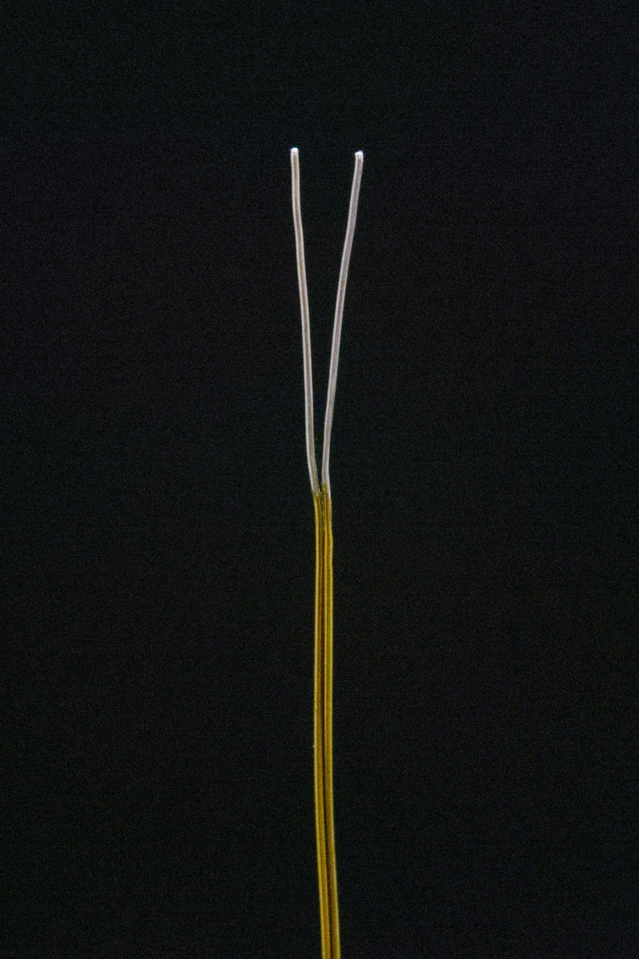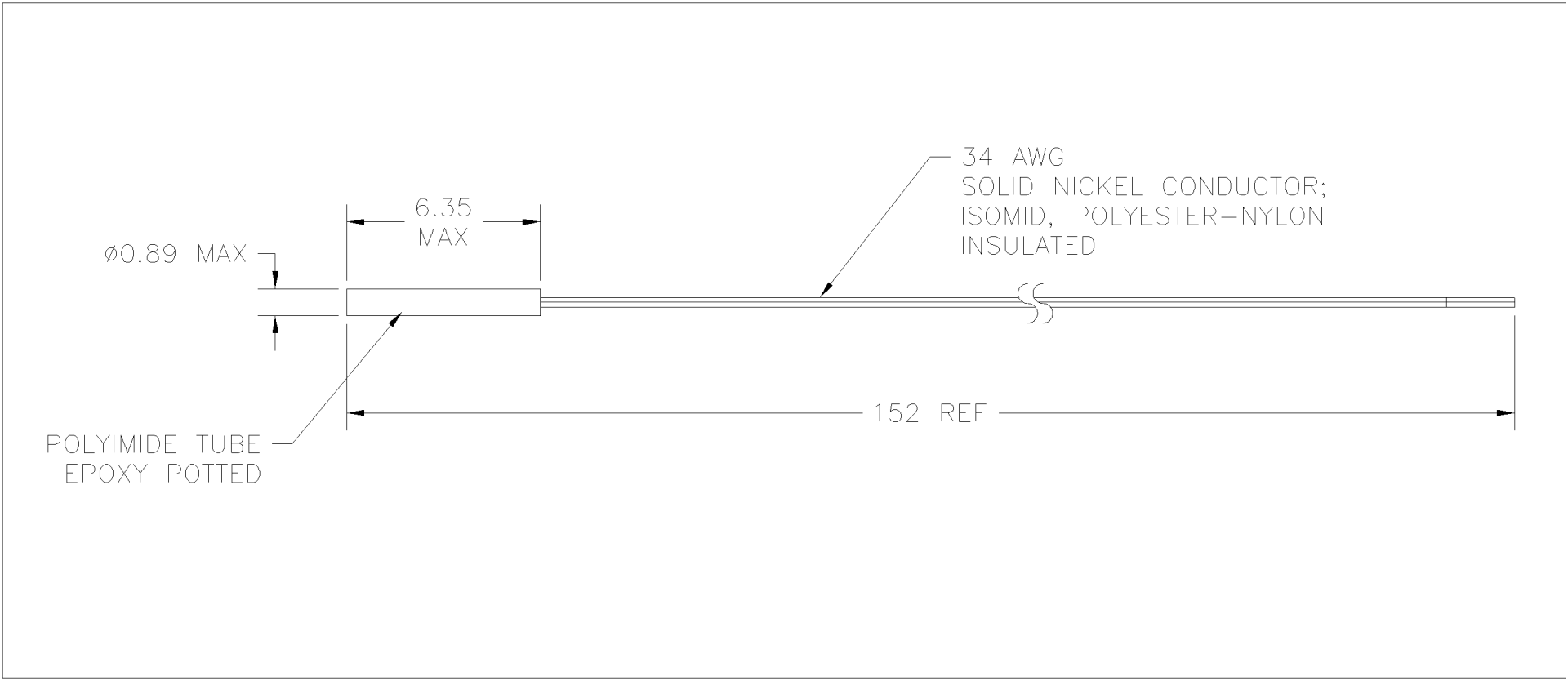 Wire is 32 gauge solid, overall length is 152 mm. The wires have a thin varnish insulation (similar to magnet wire) and are not terminated. Although delicate, these thin wires have an advantage in that they do not conduct much heat into the measurement head of the sensor, and they are easy to preheat or precool. This helps ensure accurate temperature measurements. We do recommend that if you will be bending the wire leads against a sharp metallic edge (such as when exiting a sensor hole) the wires be protected with a thin layer of epoxy or heat shrink so the edge does not cut through the varnish and electrically short the sensor. Of course, you can radius to the sharp edge so it will not abrade the varnish.