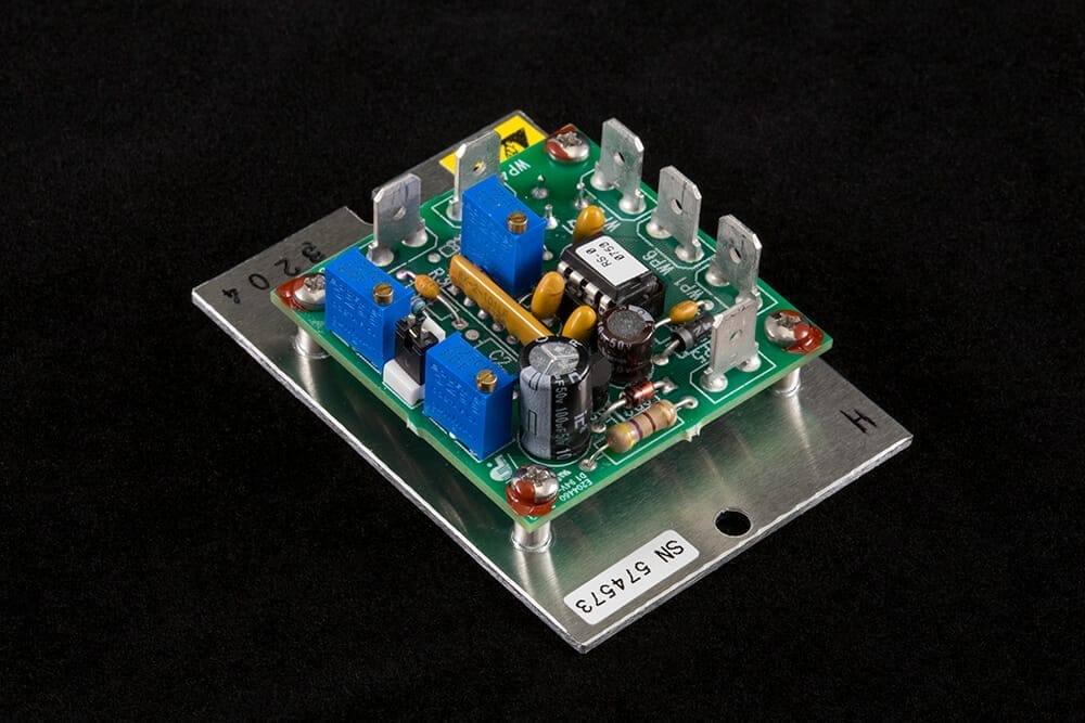 Adjustments for set-point, proportional gain, and integral gain are made via variable resistors (potentiometers) located on the printed circuit board. These adjustment values can be pre-programmed into the controller for large volume applications thus negating the need to adjust each controller individually.